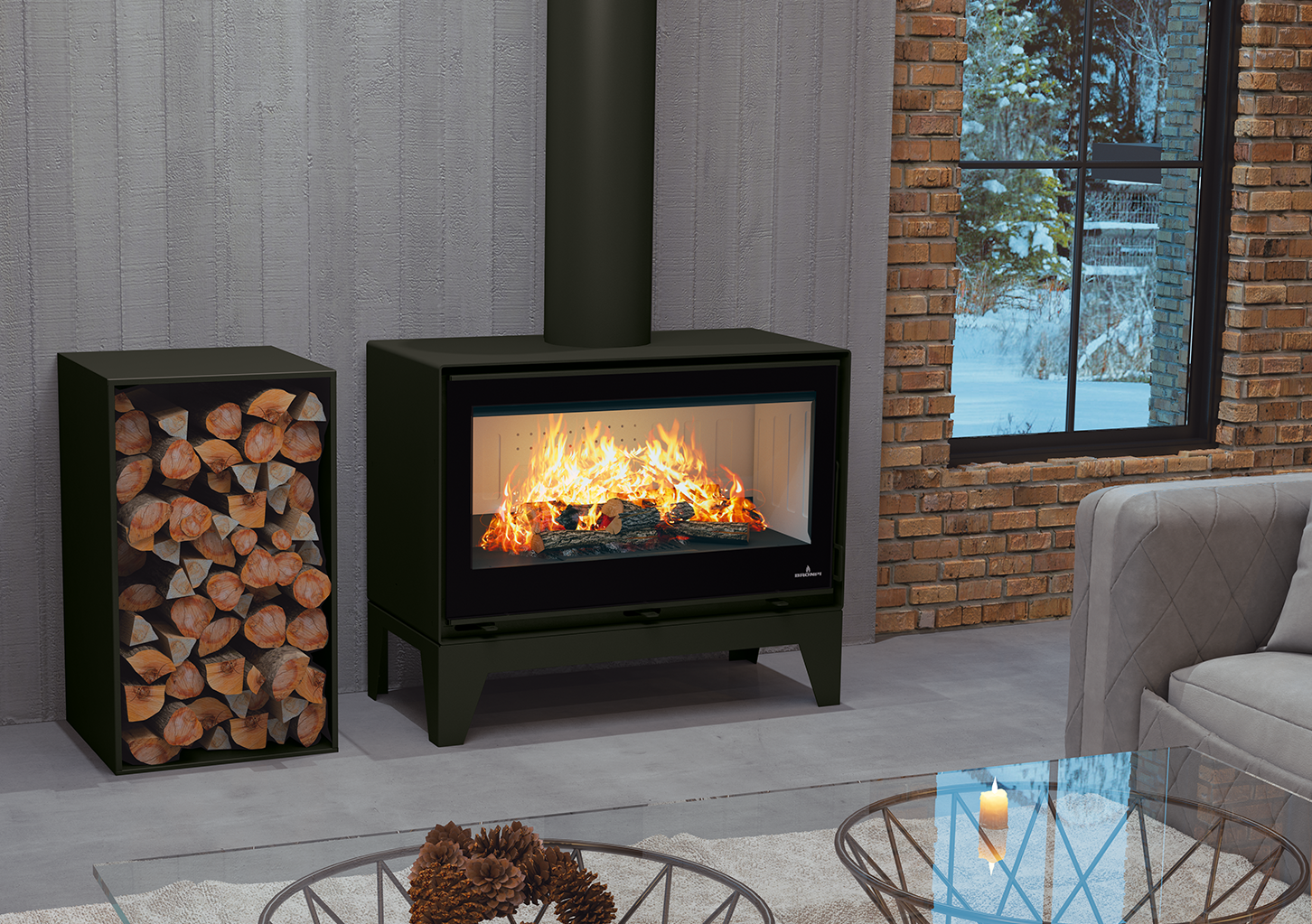 Versión para colgar, tipo estufa (patas) y con leñero integrado